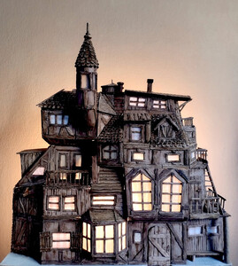 2022Fantasiegebouw gemaakt van karton en ijslolliestokjes met ledverlichting. Gaandeweg gebouwd, zonder ontwerptekening.