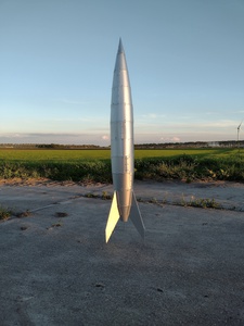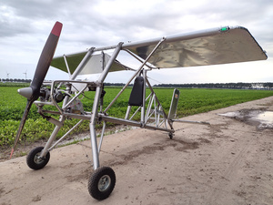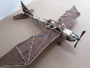2016Levensgroot vliegtuig, gebouwd van o.a. gebruikte aluminium buizen, met werkende stuurknuppel, navigatieverlichting en benzinemotor.