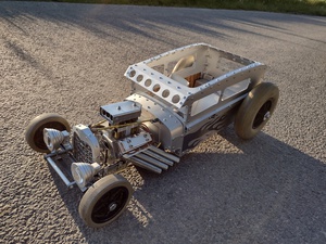 2022Ford Tudor hot rod, gemaakt van aluminium en hergebruikte materialen, met werkende stuurinrichting en koplampen.