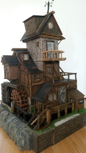 2020Fantasie watermolen gemaakt van hout en karton, met draaiend rad en verlichting.
