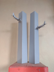 2002Gemaakt van 2 ikea tafelpoten en een stuk steigerhout met 2 speelgoedvliegtuigjes.