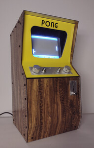 2018Werkende miniatuur Pong automaat (tennis computerspel). Aluminium kast beplakt met folie, met mini zwart-wit monitor en spel-electronica. De kast is uit te breiden met een groot scherm of beamer en losse controllers.